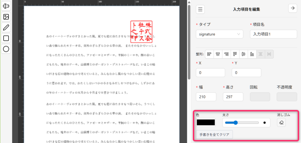 手書き時の色・太さ・消しゴムの設定を、PDF編集画面右側のプロパティパネルから操作できるように修正しました。