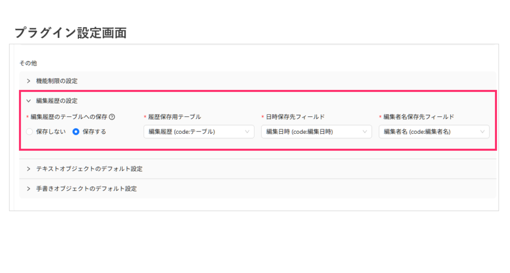 次に、PDF編集履歴を保存する設定を行います。プラグイン設定画面の「編集履歴の設定」で、事前に設定した編集履歴保存用のテーブルとフィールドを指定します。