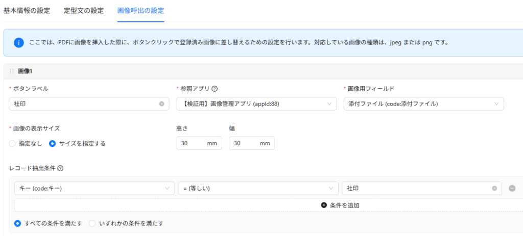 最後に、画像呼び出し機能の設定を行います。事前に用意しておいた社印や確認印の画像を「画像管理アプリ」から呼び出せるように、条件を設定します。