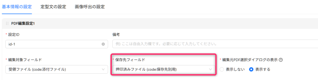 まず、編集内容の保存先を「別のフィールド」に指定します 。編集対象を「受領ファイル」、保存先を「押印済みファイル」に設定します。こうすることで、元のファイルを残したまま、押印後のファイルを別フィールドに保存することができます。
