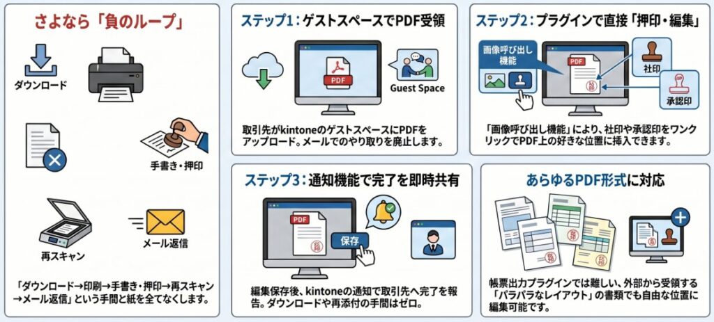 取引先とのやり取りにkintoneのゲストスペースを導入したものの、送られてきたPDFに自社で押印する作業だけが手作業として残っているようなことはないでしょうか。データ共有はできても、最終的な確認印のためにPDFをダウンロードして印刷し、ハンコを押して再度スキャン、さらにメールで返信する。ファイルのやり取りをメールではなくゲストスペース内のアプリを介して行うように変えたとしても、PDFに関わる部分はマニュアル作業が残ってしまう。