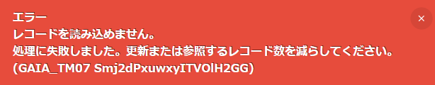 GAIA_TM07エラー時は、「処理に失敗しました。更新または参照するレコード数を減らしてください。」というエラーメッセージが表示されます。