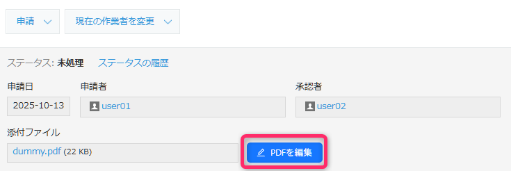 - 上長はPDFを編集し、編集後に「状況」フィールドを「編集完了」に変更する。