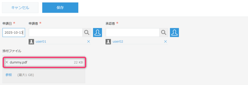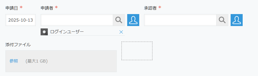 - 「添付ファイル」フィールド:PDFファイルの添付用
