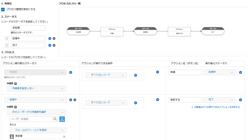 あわせてプロセス管理を有効化し、上長承認を通すような設定を行います。