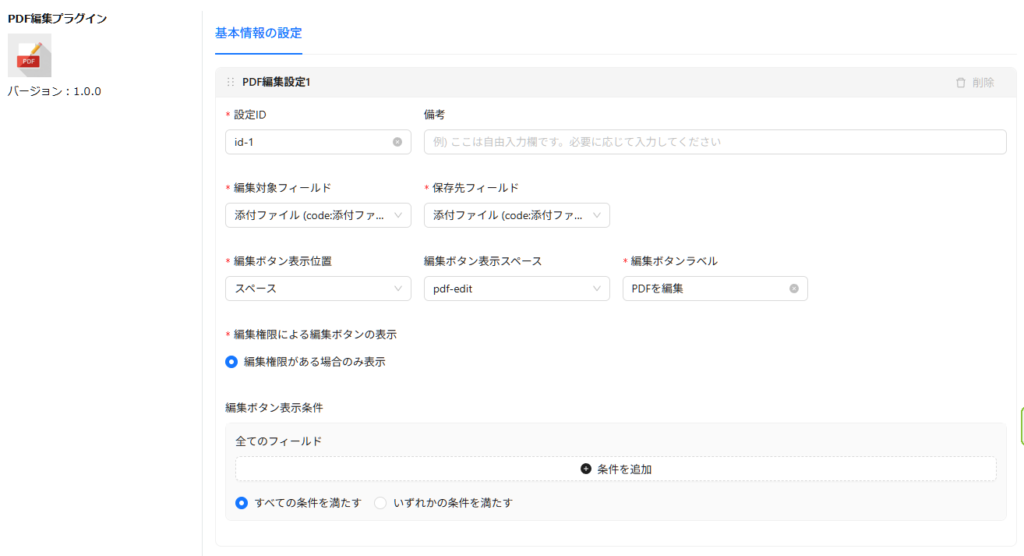 例えば、プラグインの設定画面で「状況」フィールドの値が「編集可能」の時のみ、PDF編集ボタンを表示するという条件を設定できます。