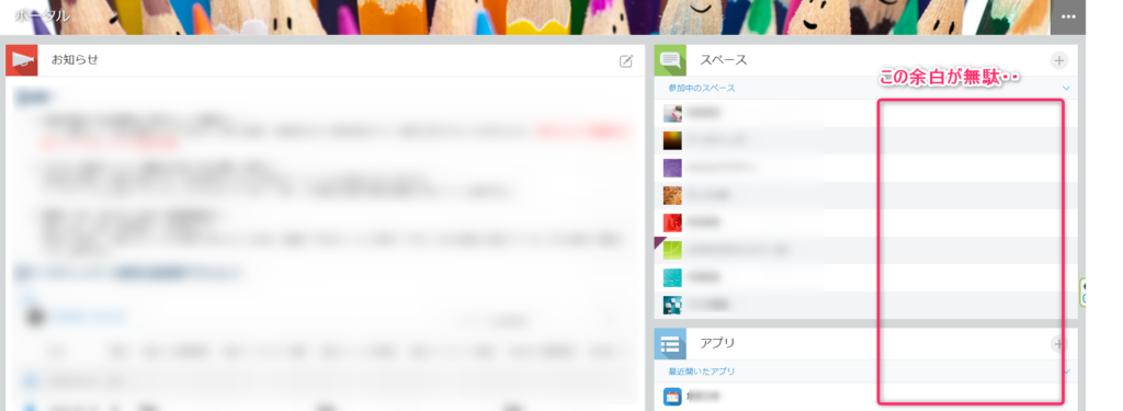 ポータル画面右側の、スペースやアプリの名前が表示される部分が広くなっている。前はこんなに広くなかったような・・・というのがきっかけで、気づきました。