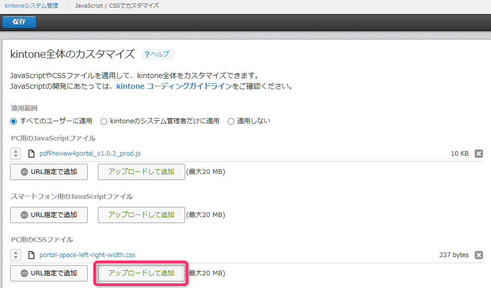 次に、kintoneシステム管理画面→kintone全体のカスタマイズ画面を開き、PC用のCSSファイルに先ほどのファイルをアップロード後、保存します。