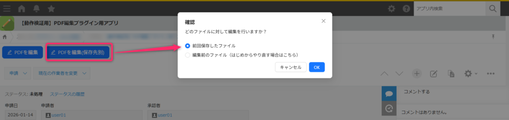 1回目の編集時:確認ダイアログは表示されない。(編集対象フィールドのファイルに対して編集)