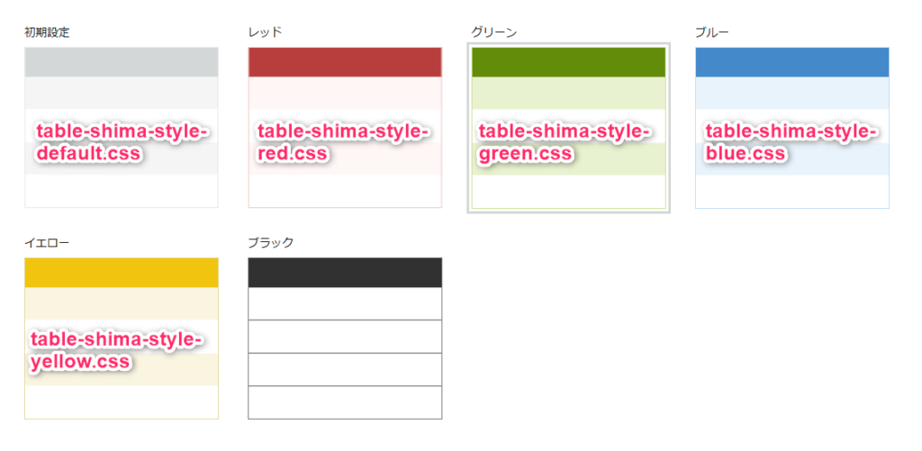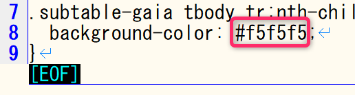 例えば「table-shima-style-default.css」の場合、ファイル内に「#f5f5f5」という部分があります。ここを別のカラーコードに変更することで、オリジナルの色にすることができます。